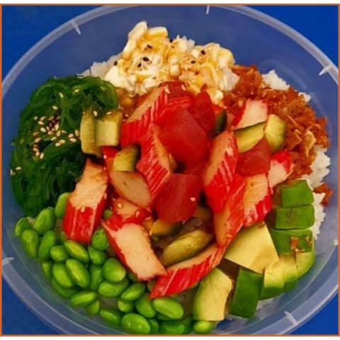 Haiwaii Poke Spicy Surimi & Tunamayo sweetcorn, goma wakame, Cucumber, avocado, edamame, dry shallot -