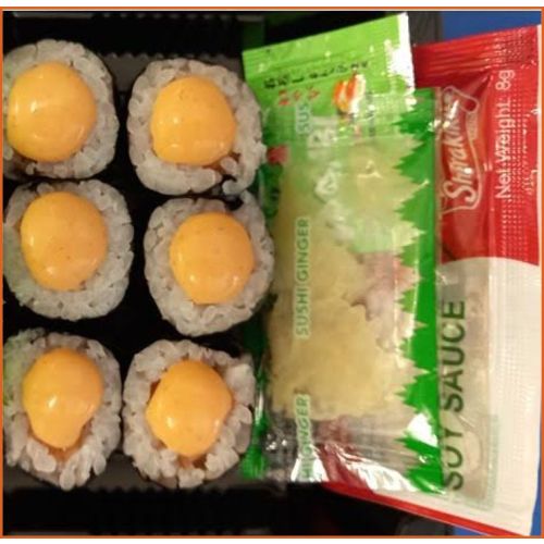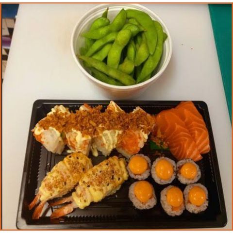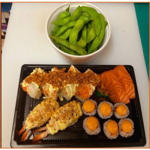 Spicy Salmon Maki (6), Seared Cooked Prawns (2), Califonia Roll (4), Salmon Sashimi (2), edamame