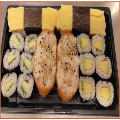 Cucumber Maki(6), Avocado Maki (6), Inari Pocket (2),Tamago (2), edamame