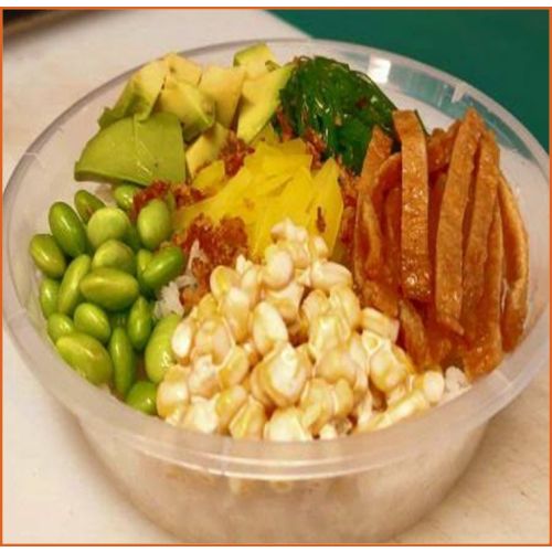 Veg Poke RiceGoma wakame, Avocado, Yellow radish,sweetcorn Mayo , Edamane & inari